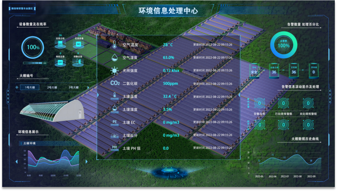 通過天地圖、虛擬園區(qū)、智能大棚等園區(qū)管理控制板塊,可以直觀立體的展示園區(qū)分布、大棚數(shù)量、種植面積以及物聯(lián)網(wǎng)設(shè)備在線等情況,并可以具體查看某個大棚的編號、建棚日期等基本信息以及棚內(nèi)農(nóng)作物的實時生長情況。